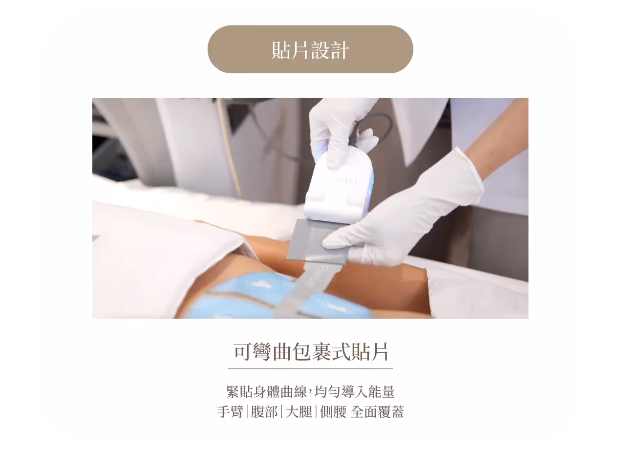 靈活貼合的貼片設計,可應用於手臂、腹部、大腿等難瘦部位,真正做到「邊瞓邊瘦」。療程全程無痛、無創,體感溫暖舒適,每個部位只需約 15 分鐘,適合生活節奏快、追求高效與無壓體驗的你。