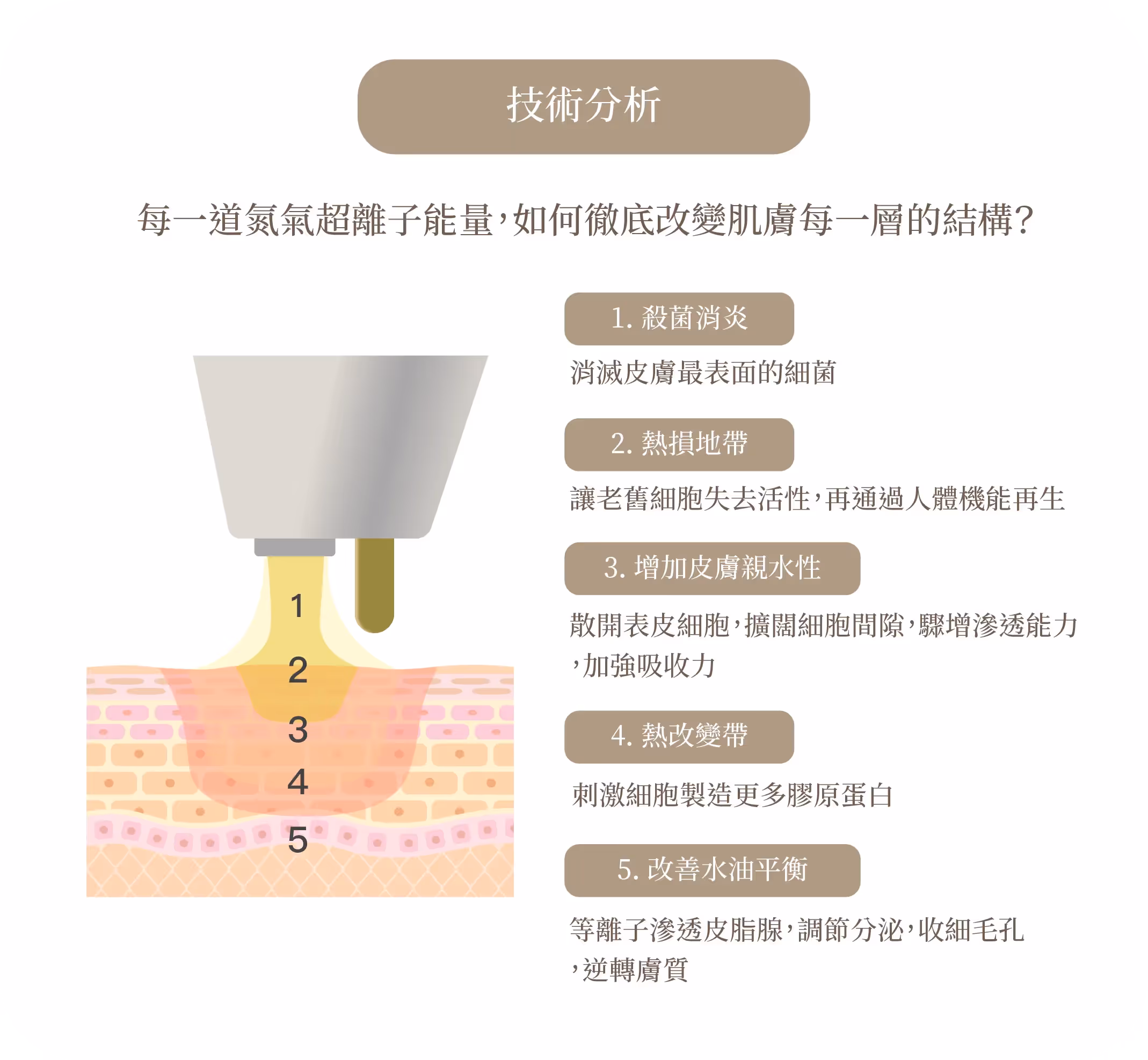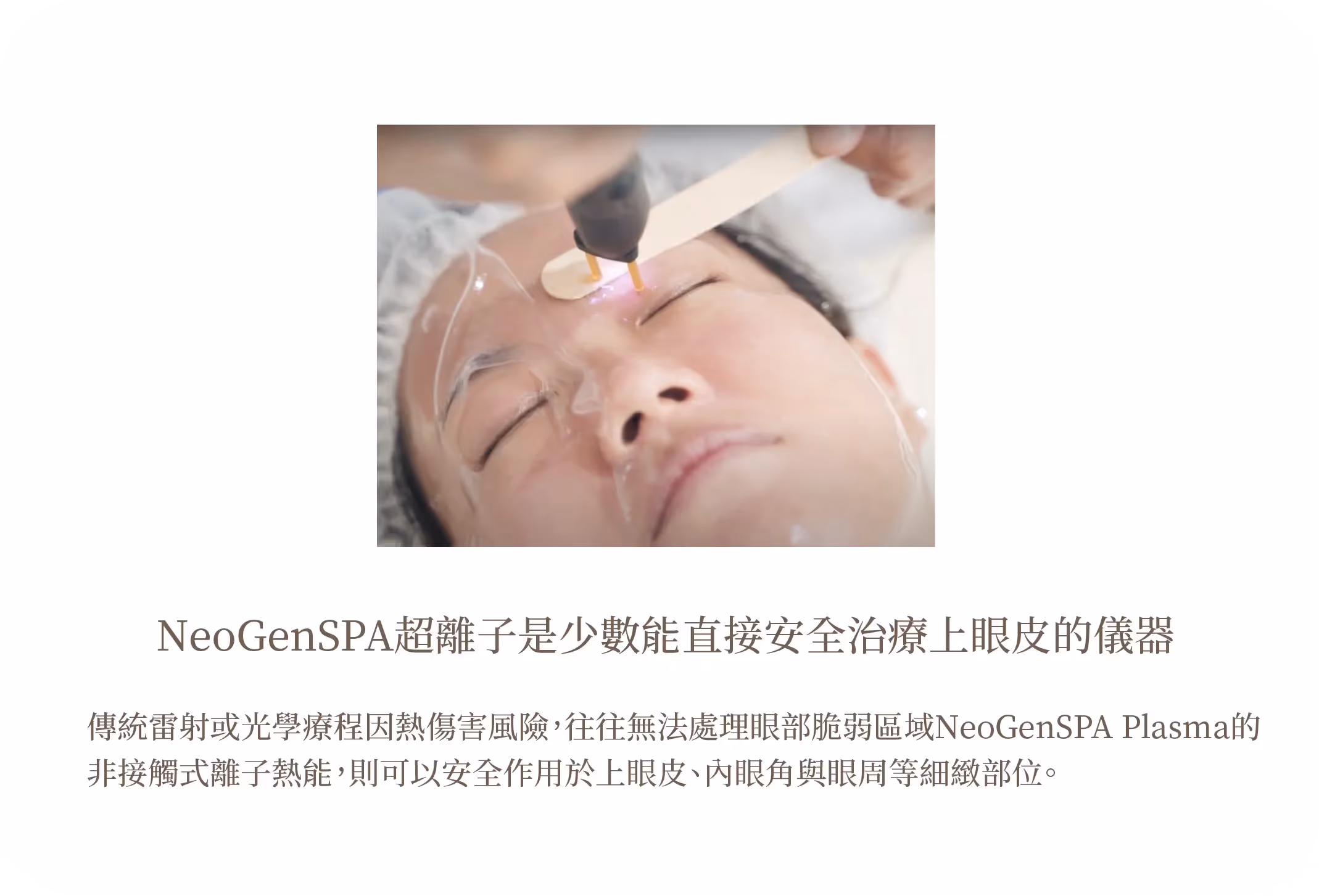 不同於傳統光熱儀器,它採用獨特的離子電漿技術,在不造成表皮創傷的情況下,有效處理各類皮膚老化問題,尤其在眼部細緻區域的應用上極具突破性,是市面少見可直接應用於眼皮、眼蓋等脆弱位置的技術。